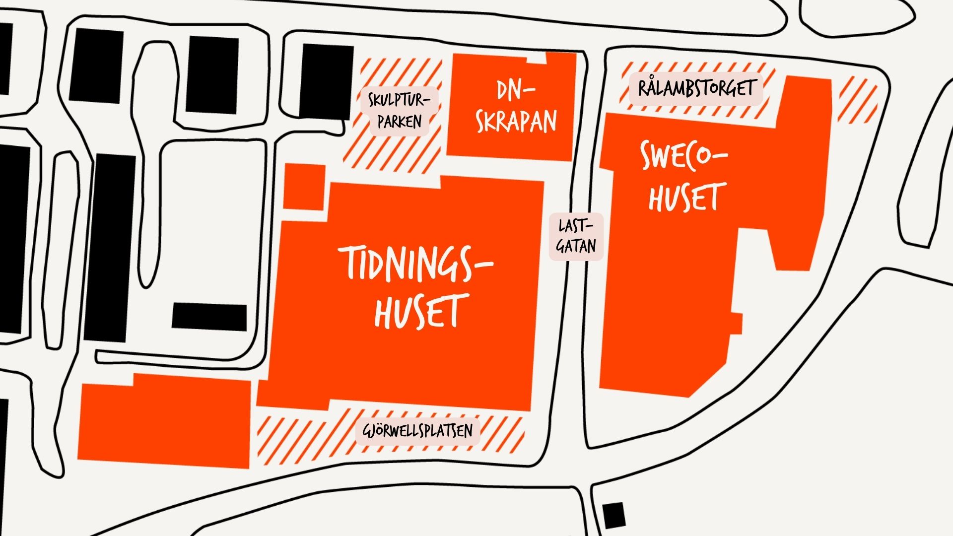 Tidningskvarteren har i över 60 år varit en plats där idéer, nyheter och människor möts. Här låg tidigare några av Sveriges största tidningsredaktioner. Idag har området utvecklats till ett modernt och levande kontorskvarter där ni sitter omgivna av välkända hyresgäster som Sweco och Bonnier News, och av klassiska byggnader som DN-skrapan, Tidningshuset och G22 & G28.